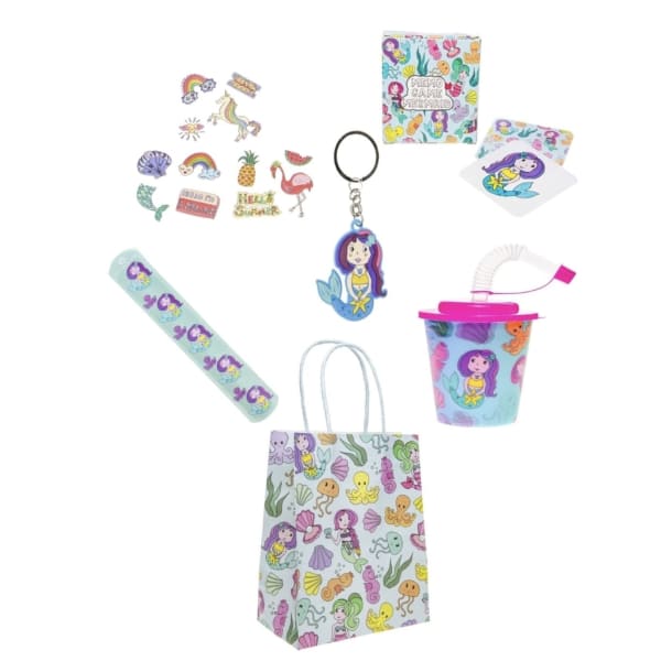 Pack of 10 Pre Filled Mermaid Theme Kids Party Favour Bags – Gift Bags with Reusable Cup & Themed Toys