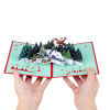 This festive pop-up card opens to reveal a charming snowy village surrounded by evergreen trees. White houses with dark roofs, a cheerful snowman, and reindeer bring the scene to life, while Santa and his sleigh soar above, spreading holiday cheer. The light blue base decorated with candy cane patterns adds a playful seasonal touch. The red cover features a cut-out ornament window, offering a glimpse of the magical scene inside. Its intricate three-dimensional design makes it as much a keepsake as a greeting. Measuring 10.5 x 15 cm when folded, it expands into a delightful holiday display. A perfect way to share warmth, joy, and the spirit of Christmas.
