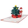 This festive 3D pop-up card features Santa Claus standing on a ladder, joyfully decorating a Christmas tree with ornaments and gifts below. The scene is full of cheerful details, including a red base with snowflakes and holly, and a bright red cover that reads “MERRY CHRISTMAS” beneath a stylized tree and presents. When opened, the card reveals a vibrant holiday display with layered branches, colorful baubles, and Santa holding his sack. The card measures 15 x 20 cm and includes a blank insert (8.5 x 13 cm) for your personal message. It folds flat for easy mailing and pops up into a delightful seasonal centerpiece. A perfect way to share warmth, joy, and festive spirit with loved ones this Christmas.