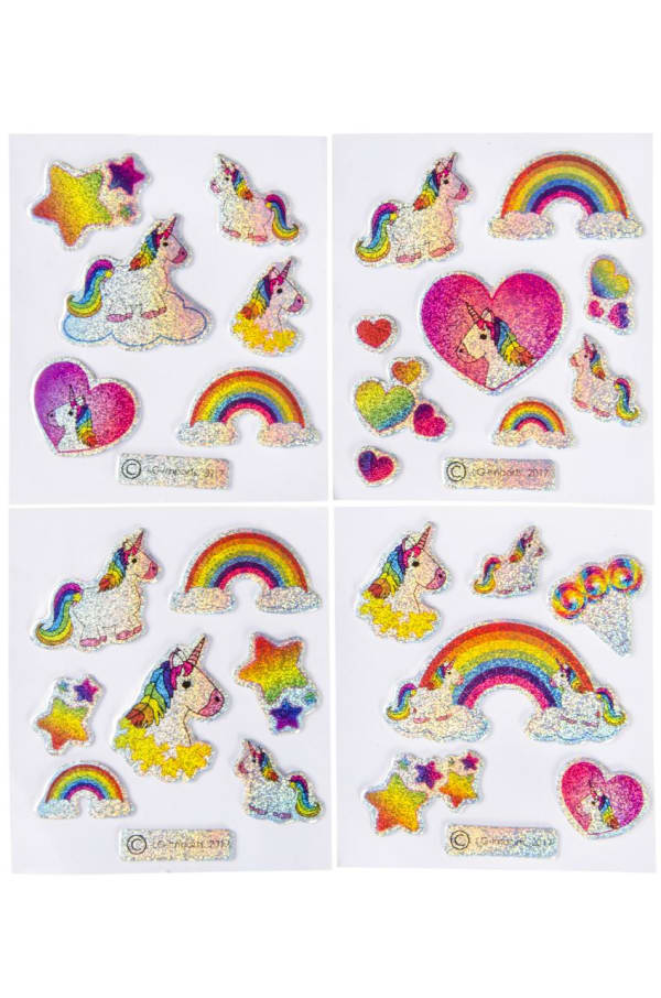 Pack of 12 Shiny Unicorn Stickers. This is a set of glittery unicorn stickers, designed for children's scrapbooking or party favors. 4 different designs available. Features unicorns, rainbows, stars, and hearts with a glittery, holographic finish. Approximate size of unicorn sticker sheet is 7 cm x 11.5 cm. One random design sheet will be supplied.
