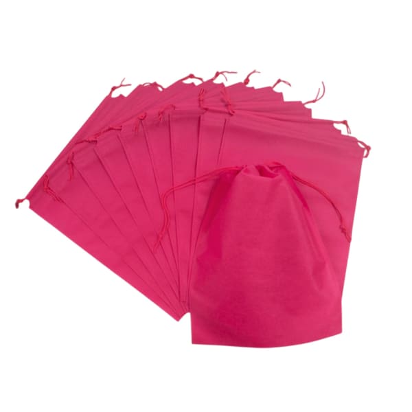 Pack of 100 Pink Coloured 32x22cm Non-Woven Drawstring Bags. This Pack of 100 pink non-woven drawstring bags is ideal for storing, organising, and presenting small items. Each bag measures 32x22cm and is made from durable yet lightweight non-woven material. The drawstring closure ensures contents are kept secure while allowing easy access. Perfect for jewellery, gifts, party favours, crafts, cosmetics, and promotional use at events, retail, or home.