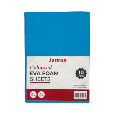 Pack of 10 A4 Blue Coloured Eva Foam SheetsThis pack of 10 A4 Blue EVA foam sheets is suitable for a wide range of craft, school, and DIY projects. Each sheet measures A4 size (297 x 210mm approx.) with a 2mm thickness, providing a flexible yet durable material that is easy to cut, shape, and glue. The smooth surface and bright Blue colour make it ideal for art and craft work, model making, decorations, and creative activities. Lightweight and easy to handle, these foam sheets are suitable for both children and adults, offering a practical solution for everyday crafting use.